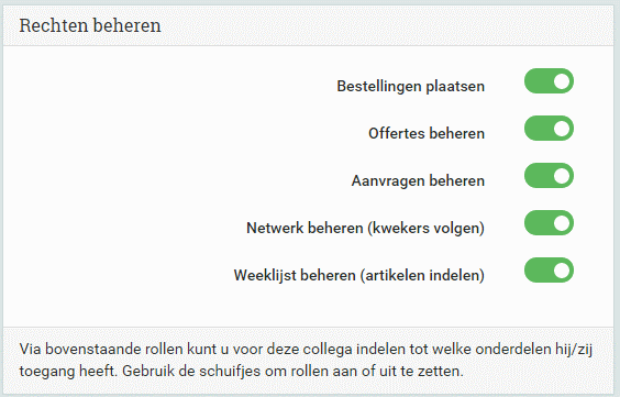Omdat niet iederen dezelfde functie bekleedt binnen een bedrijf komt het voor dat de ene gebruiker iets meer op FloraXchange mag dan een andere gebruiker. Deze rechten zijn voor een exporteur zelf te beheren. De 'accountmanager' heeft middels de schuifjes de mogelijkheid om in grote lijnen de rechten in te stellen voor zijn collega's.