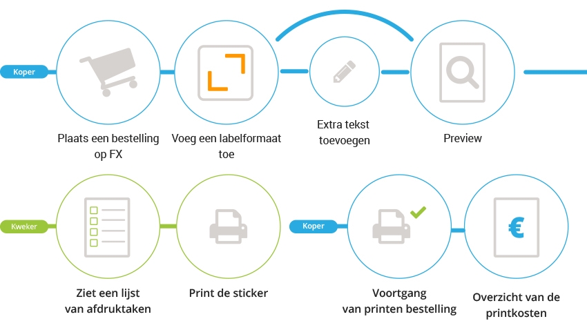 Kwekers printen de stickers uit. Hierbij houdt FloraXchange rekening met de eigen instellingen van de kweker. Zo kan de kweker kiezen om te werken met een voorloopsticker en kan hij kiezen voor fust- en potstickers op een gecombineerde rol of juist los.
